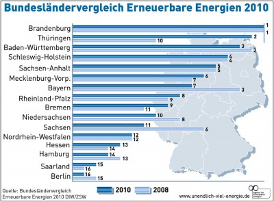 „Ausbauerfolge bei den erneuerbaren Energien sind nicht nur eine Frage von Windstärken und Sonnenstunden. Die Bundesländer haben es selbst in der Hand, ob sich innovative Unternehmen ansiedeln, wo neue Technologien produziert werden und welche Planungsvorgaben für Anlagen und Projekte herrschen“, sagt Jörg Mayer, Geschäftsführer der Agentur für Erneuerbare Energien. Zwar würden Biomasse, Sonnenenergie und Windkraft mit bundesweiten Förderprogrammen wie dem Erneuerbare-Energien-Gesetz oder dem Marktanreizprogramm unterstützt. Dennoch könnten die Bundesländer zum Beispiel mit dem Abbau von Planungshürden, mit einer ambitionierten Wärmegesetzgebung oder den richtigen Schwerpunkten in der Forschungs- und Bildungspolitik die erneuerbaren Energien voranbringen.