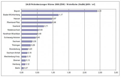 Pelletsheizungen sind in Deutschland besonders bei den Bayern beliebt. Das zeigen Zahlen einer Vergleichsstudie zum Einsatz erneuerbarer Energien in den Bundesländern. Demnach haben Pelletsheizungen 2008 in Bayern 2,4 Kilowattstunden Wärme pro Quadratmeter Wohnfläche erzeugt. Das Bundesland liegt damit weit vor Baden-Württemberg (1,17), Hessen (0,97) und Rheinland-Pfalz (0,96). Am wenigsten heizen die Menschen in Bremen (0,13), Hamburg (0,12) und Berlin (0,07) mit dem modernen und umweltfreundlichen Brennstoff.