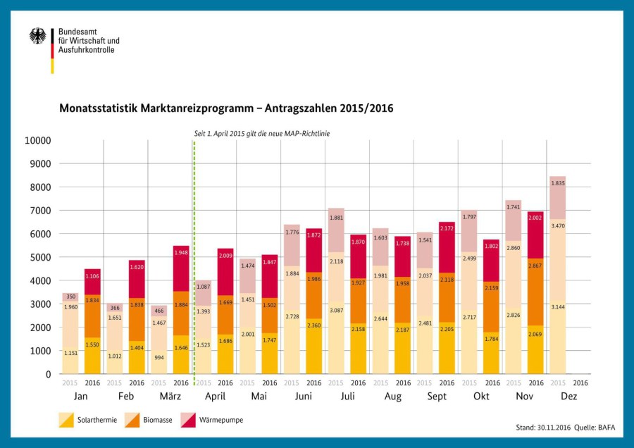 Damit hält der positive Trend seit Juli an. Gegenüber dem Vorjahr konnte die Branche ihre Verkaufszahlen jedoch kaum steigern. Mit insgesamt 21.742 Förderanträgen in den ersten elf Monaten des Jahres bewegt sich die Nachfrage nach Biomasseheizungen auf einem ähnlichen Niveau wie 2015. Damals waren bis November 21.301 Förderanträge bei dem BAFA eingereicht worden. Während das immerhin einem geringen Wachstum von zwei Prozent entspricht, ging die Zahl der Förderanträge für Solarthermieanlagen um zehn Prozent zurück. Freuen können sich die Wärmepumpenhersteller. Die Zahl der Förderanträge stieg in den ersten elf Monaten gegenüber dem Vorjahreszeitraum um 42 Prozent.