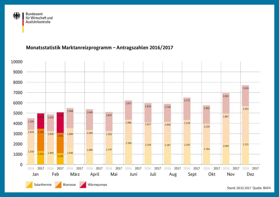 1.961 Förderanträge für eine Biomasseheizung sind beim Bundesamt für Wirtschaft und Ausfuhrkontrolle (BAFA) im Februar 2017 eingegangen – sieben Prozent mehr als im Vorjahresmonat.