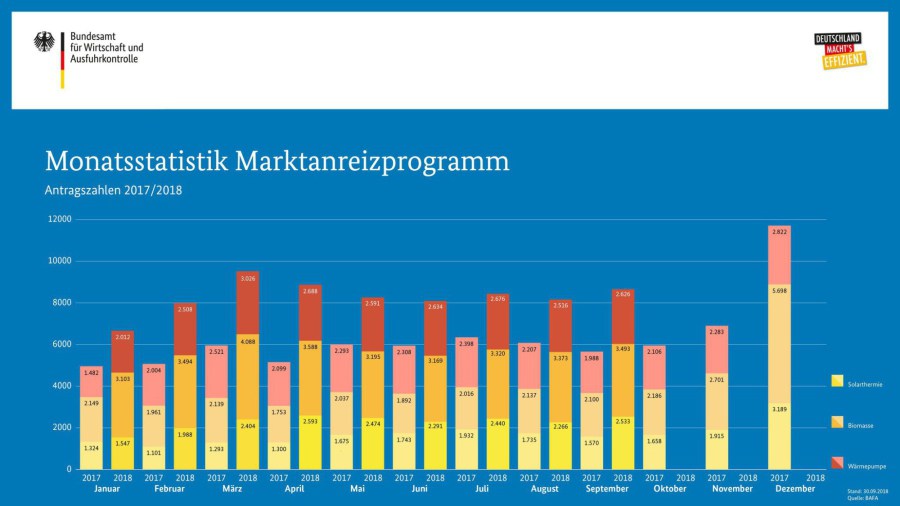 Die BAFA-Zahlen im September 2018 bleiben hoch. Die Zahl der Förderanträge für eine Ökoheizung nahm gegenüber August um sechs Prozent auf 8.652 zu.