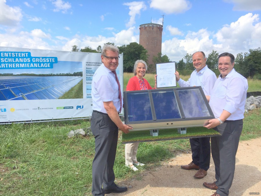 SWLB-Geschäftsführer Bodo Skaletz, Kornwestheims Oberbürgermeisterin Ursula Keck, Ludwigsburgs Oberbürgermeister Werner Spec und SWLB-Geschäftsführer Christian Schneider (im Foto von links) freuen sich über den Baubeginn. Zumal die Zahlen ihres Projekts für die Solarthermie in Deutschland beeindruckend sind: Neun Megawatt wird die Solarthermieanlage an Leistung liefern. 5.500 Megawattstunden Wärme wird sie pro Jahr erzeugen und damit 3.700 Tonnen Kohlendioxid vermeiden. 300 Durchschnittshaushalte lassen sich mit der umweltfreundlichen Energie versorgen. Das Projekt wird 15 Millionen Euro kosten. Zwei Drittel davon steuert der Bund als Förderung bei.