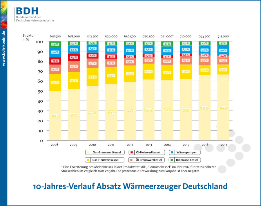 Seine Jahresbilanz zum Heizungsmarkt 2017 hat der Bundesverband der Deutschen Heizungsindustrie (BDH) veröffentlicht. Mit 712.000 abgesetzten Wärmeerzeugern und einem Absatzplus von drei Prozent gegenüber dem Vorjahreszeitraum blickt er auf ein erfolgreiches Jahr zurück.