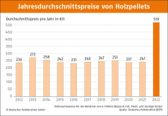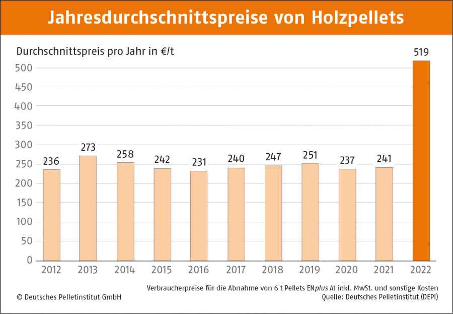 Laut dem Deutschen Pelletinstitut (DEPI) werden allerdings voraussichtlich nur diejenigen Zuschüsse beantragen können, die 2022 Holzpellets zu einem Preis von mehr als zwölf Cent pro Kilowattstunde gekauft haben. Die genaue Ausgestaltung der staatlichen Hilfe sei noch unklar. Die Abwicklung soll über die Bundesländer erfolgen. Das DEPI werde aber zeitnah informieren. 2022 lag der durchschnittliche Preis für Holzpellets der Brancheneinrichtung zufolge bei 518,59 Euro pro Tonne, das entspricht 10,37 Cent pro Kilowattstunde. Heizöl kostete durchschnittlich 13,63 Cent pro Kilowattstunde, Erdgas 16,74 Cent.