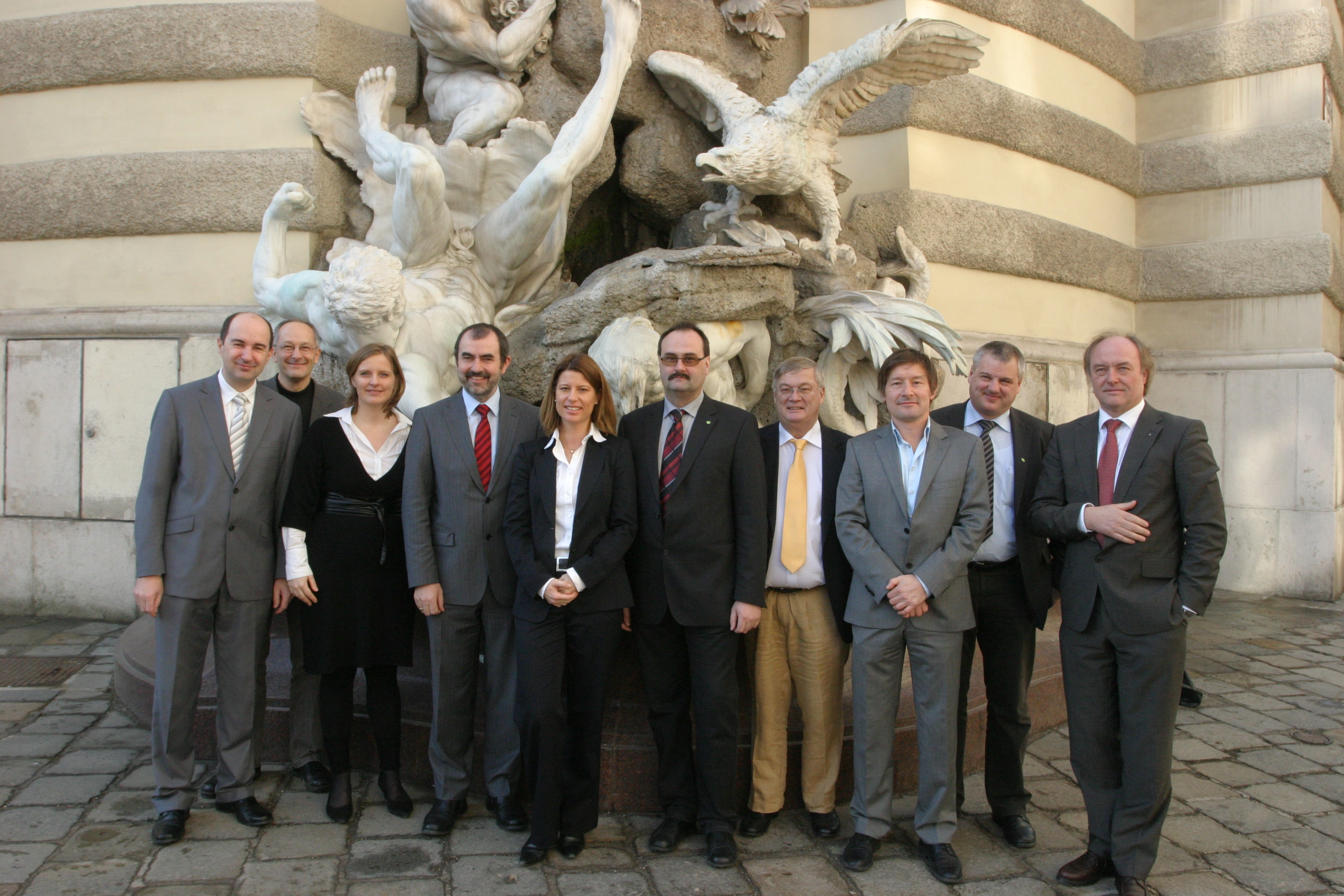 Die Gründungsmitglieder des Bundesverbands Erneuerbare Enegrie Österreich (von links): Horst Jauschnegg (Österreichischer Biomasse-Verband), Christian Rakos (Propellets Austria), Martina Prechtl (Geschäftführerin Bundesverband Erneuerbare Energie), Josef Plank (Präsident Bundesverband Erneuerbare Energie), Barbara Schmidt (Oesterreichs Energie), Norbert Hummel (ARGE Kompost und Biogas), Hans Kronberger (Photovoltaik Austria), Stefan Moidl (IG Windkraft), Franz Kirchmeyr (ARGE Kompost und Biogas) und Christoph Wagner (Kleinwasserkraft Österreich).