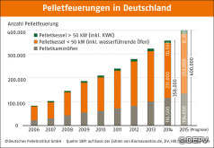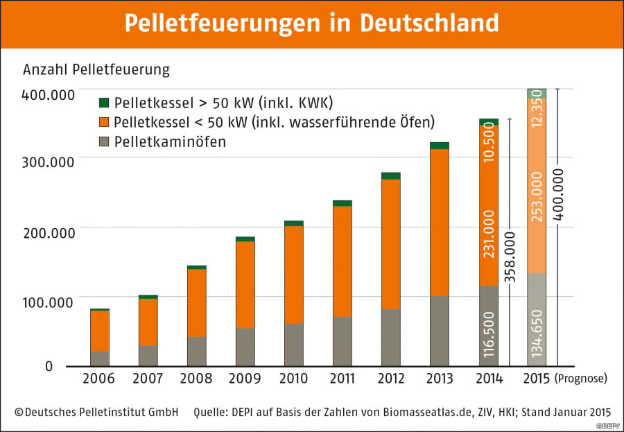 Der DEPV beziffert den Bestand an Pelletsanlagen in Deutschland auf 358.000 Anlagen. Beim Großteil von ihnen, 231.000 Stück, handelt es sich um Heizkessel für Ein- und Zweifamilienhäuser mit Leistungen unter 50 Kilowatt. Hierin enthalten sind auch wasserführende Pelletsöfen. Zudem wärmen 116.500 Pelletskaminöfen in deutschen Wohnzimmern. Weiterhin gut nachgefragt werden nach Verbandsangaben Pelletsfeuerungen über 50 Kilowatt Leistung, von denen es 10.500 Anlagen in Deutschland gibt. Sie verbrauchen 40 Prozent der im Land genutzten Pellets.