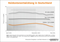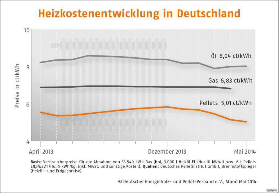 Im Mai 2014 ist der Preis für Holzpellets durchschnittlich um rund 7 Euro pro Tonne gesunken. Das meldet der Deutsche Energieholz- und Pellet-Verband e.V. (DEPV) mit dem DEPV-Preisindex für Mai 2014. Der Preis beträgt pro Tonne derzeit durchschnittlich 250,48 Euro. Das sind 2,6 Prozent weniger als im Vormonat und 5,1 Prozent weniger als im Vorjahr. Gegenüber Heizöl bieten Pellets aktuell einen Preisvorteil von knapp 38 Prozent.