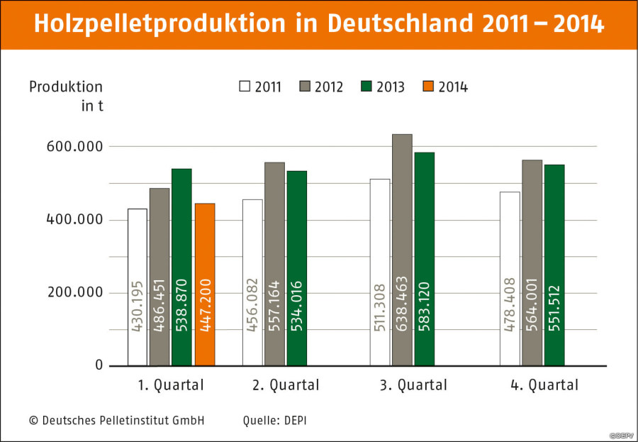 Als Rohstoff setzten die Pelletproduzenten in Deutschland auch im ersten Quartal 2014 weiterhin vor allem Sägerestholz ein (82,8 Prozent). Der Einsatz von nicht sägefähigem Rundholz (sog. Industrieholz) lag bei 17,2 Prozent. Über 99 Prozent der Pellets werden für die Bereitstellung von Wärme in kleinen und mittleren Anlagen hergestellt (Qualitäten A1 und A2). Lose Ware, die mit dem Tankwagen angeliefert wird, machte im Pellethandel 83 Prozent aus, Sackware 17 Prozent. Der Großteil der Pellets wird demnach in Pelletkesseln eingesetzt, der Rest in Pelletkaminöfen. Über 85 Prozent der Inlandsproduktion wurde im ersten Quartal auch im Inland verbraucht, knapp 15 Prozent exportiert.
