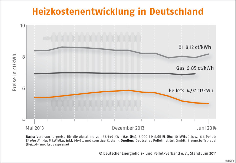 Wie der Deutsche Energieholz- und Pellet-Verband e.V. (DEPV) bei der Bekanntgabe des DEPV-Preisindex Juni berichtet, kostet eine Tonne (t) Holzpellets im Juni durchschnittlich 248,69 EUR. Das sind 0,7 Prozent weniger als im Vormonat und 6 Prozent weniger als im Juni 2013. Ein Kilogramm Holzpellets bekommt man derzeit für 24,87 Cent, eine Kilowattstunde (kWh) Wärme aus Pellets für 4,97 Cent. Im Vergleich zu Heizöl punkten Pellets mit einem Preisvorteil von fast 39 Prozent. Der Branchenverband DEPV rät Heizungsbetreibern daher, schon jetzt das Lager für den Winter aufzufüllen.