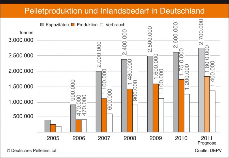 Für 2011 geht der DEPV mit 1,8 Mio. t Produktionsmenge von einer Marktkonsolidierung aus. Dieser Trend gelte auch für die Produktionskapazität, die auf 2,7 Mio. t geschätzt wird. Schmerzhaft ist für die deutschen Pelletproduzenten der hohe Rohstoffpreis. So stieg der Preis für eine Tonne Holzspäne, dem Ausgangsprodukt von Holzpellets, im Laufe des Jahres 2010 um gut 20 Prozent auf bis zu 115 EUR/t.