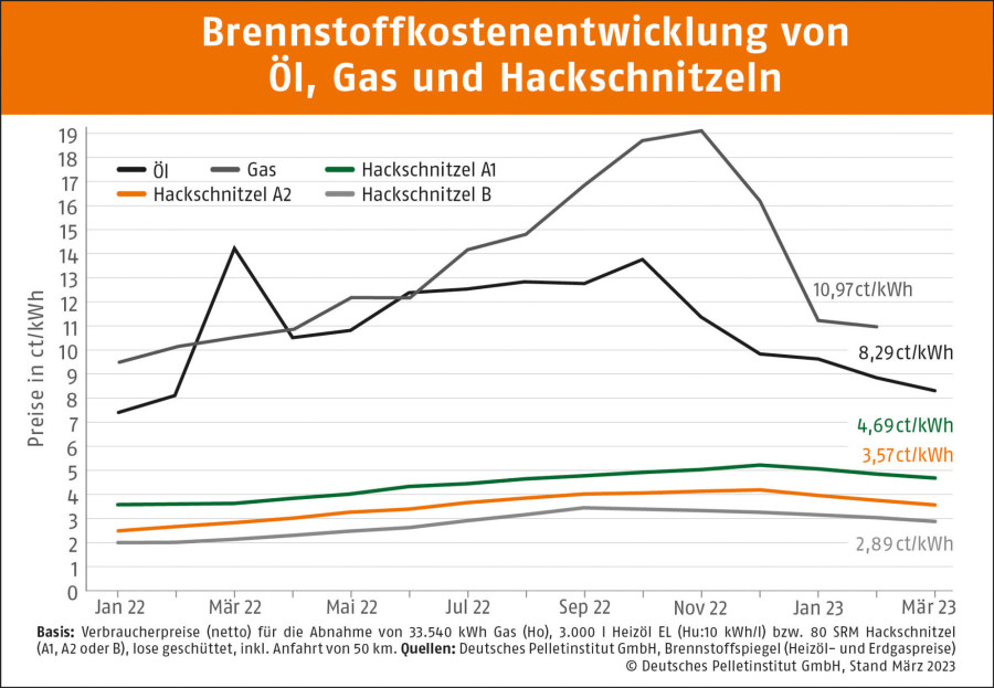 Hackschnitzelpreise im ersten Quartal 2023: Preisvorteil zu Fossilen nimmt weiter zu
