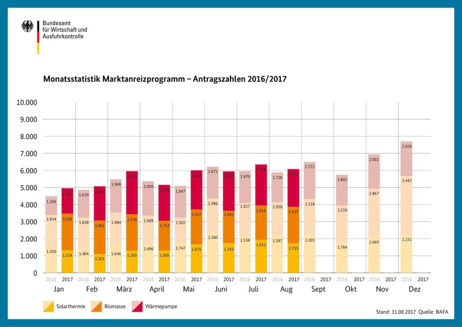 2.137 Förderanträge für eine Biomasseheizung sind beim Bundesamt für Wirtschaft und Ausfuhrkontrolle (BAFA) im August 2017 eingegangen – neun Prozent mehr als im Vorjahresmonat.