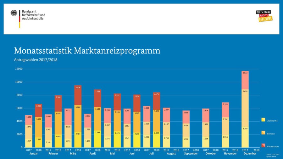 Die BAFA-Zahlen im Juli 2018 bleiben weiterhin hoch. Die Zahl der Förderanträge für eine Ökoheizung stieg gegenüber Juni um vier Prozent auf 8.436.