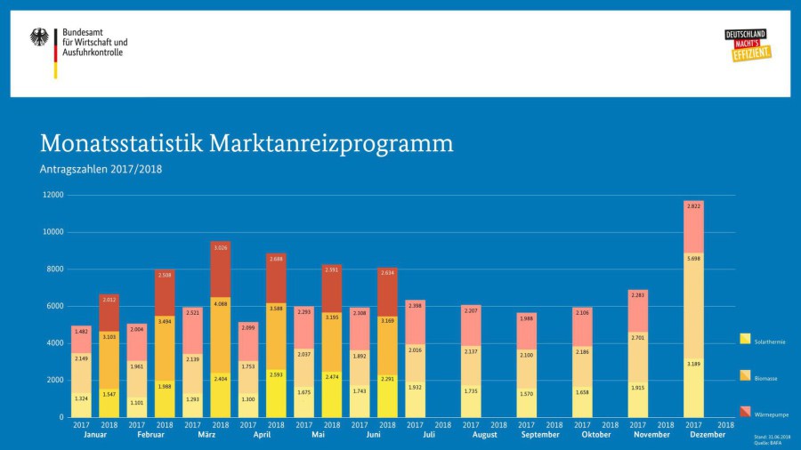 Die BAFA-Zahlen im Juni 2018 zeichnen weiterhin ein positives Bild für die Ökowärmebranche. Die Zahl der Anträge ging gegenüber Mai kaum zurück.