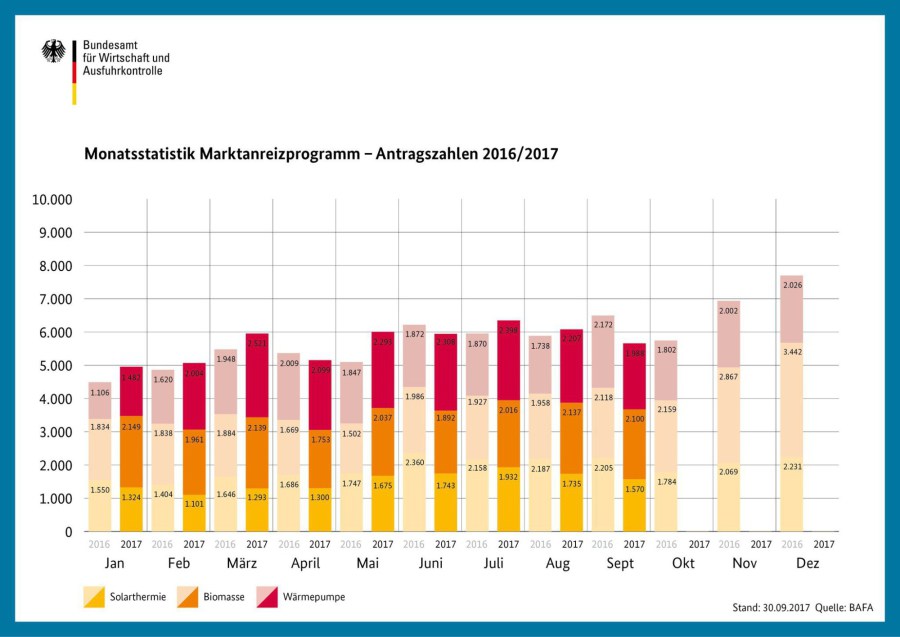 2.100 Förderanträge für eine Biomasseheizung sind beim Bundesamt für Wirtschaft und Ausfuhrkontrolle (BAFA) im September 2017 eingegangen – ein Prozent weniger als im Vorjahresmonat.