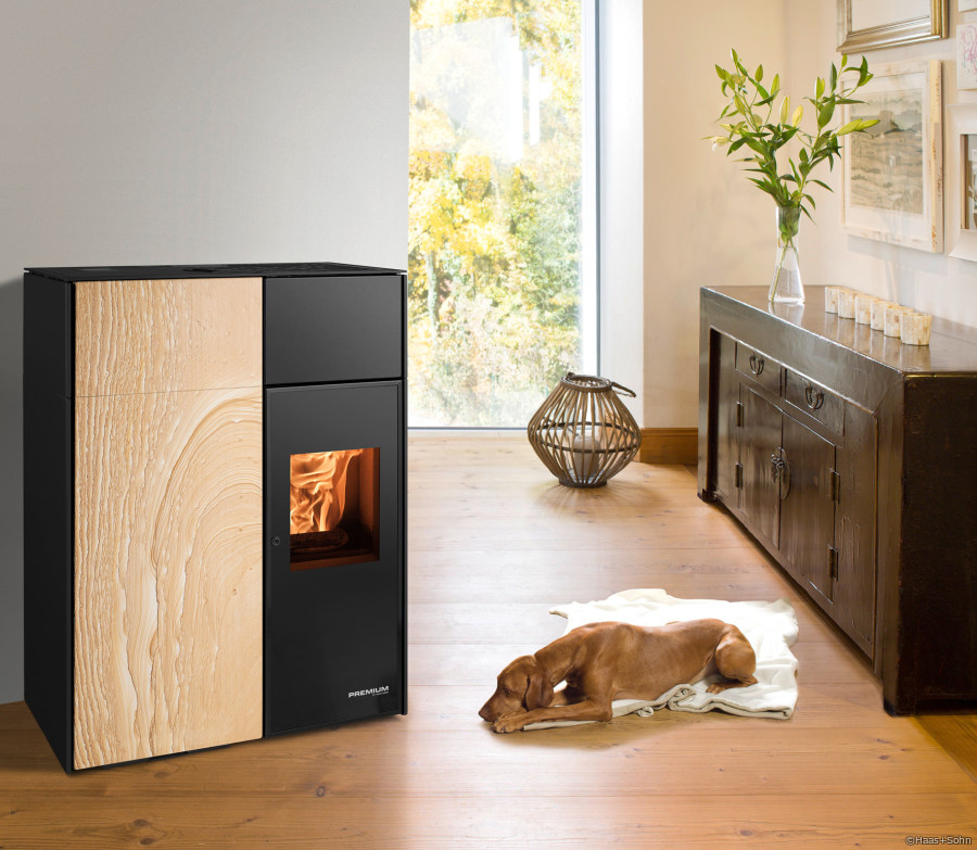 Mit einer wahren „Perle der Natur“ hat Haas+Sohn den Pelletofen „Lucca“ veredelt: Anstelle von Keramik prägt nun Sandstein die Front des schlanken Modells im platzsparenden Flat-Screen-Format. Der neue hochglanzpolierte Naturstein besticht mit seiner formschönen Maserung und verleiht dem Ofen noch mehr Eleganz.