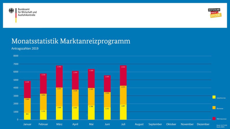 Die BAFA-Zahlen im Juli 2019: Die Gesamtzahl der Förderanträge für eine Ökoheizung stieg mit 6.825 um 22 Prozent gegenüber Juni.