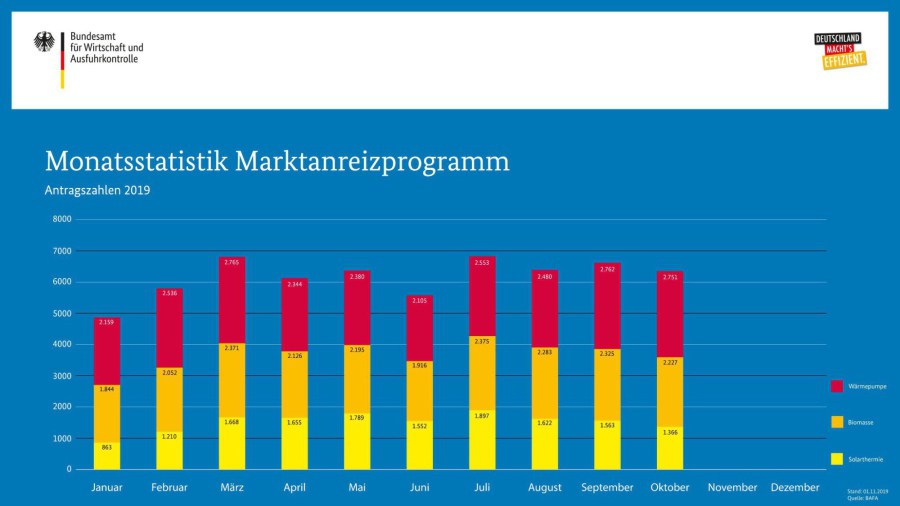 Die BAFA-Zahlen im Oktober 2019: Die Gesamtzahl der Förderanträge für eine Ökoheizung fiel mit 6.344 um fünf Prozent gegenüber September.