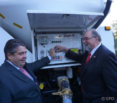 Der 200-Kilowatt-Kessel im Ratsgymnasium sparte im ersten Betriebsjahr gegenüber Heizöl 100 Tonnen Kohlendioxid ein. Die neue Pelletsheizung ist eine von mehreren, die die Kreisverwaltung seit 2008 aus wirtschaftlichen und ökologischen Gründen in seinen Liegenschaften installiert hat. So konnte sich der Wirtschaftsminister ein Bild von einer modernen und umweltfreundlichen Heizanlage machen. An die alte Ölheizung im Ratsgymnasium hat Gabriel keine guten Erinnerungen: “An die kann ich mich nur deshalb erinnern, da sie oft ausgefallen ist.” In Goslar ließ er sich von Mitarbeitern des Brennstofflieferanten Raiffeisen Agil Leese erklären, wie die Pellets aus dem Silofahrzeug in das Brennstofflager gelangen. Anschließend startete er gemeinsam mit Schulleiter Hans-Peter Dreß (rechts im Bild) die Befüllung des Erdtanks.