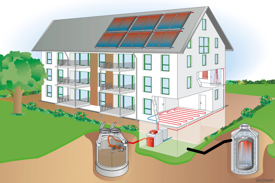 Die Großanlagen für Erdlagerung und fugenlosen Stahlbetonbehälter von Mall kommen immer öfter zum Einsatz: Bei Neubauten oder Heizungsmodernisierungen in Mehrfamilienhäusern, in denen Holzpellets als Energieträger genutzt werden, lassen sich mit den großvolumigen Speichern Heizungsanlagen effizient betreiben und Heizleistungen von bis zu 250 kW erreichen.