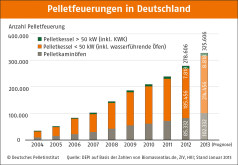 Sowohl die vom Bundesumweltministerium veröffentlichten Zahlen der über das Marktanreizprogramm (MAP) geförderten Pelletheizungen als auch die Marktzahlen des Bundesindustrieverbandes Deutschland Haus-, Energie- und Umwelttechnik (BDH) geben für das erste Halbjahr 2013 die genannten Steigerungsraten bei Pelletfeuerungen wieder oder gehen sogar darüber hinaus. Nach DEPV-Statistik setzt sich der Bestand an Pelletfeuerungen in Deutschland zu rund zwei Dritteln aus Kesseln mit einer Leistung bis 50 Kilowatt (kW), zu 30 Prozent aus Pelletkaminöfen und zu 2 Prozent aus Kesseln mit einer Leistung über 50 kW zusammen.