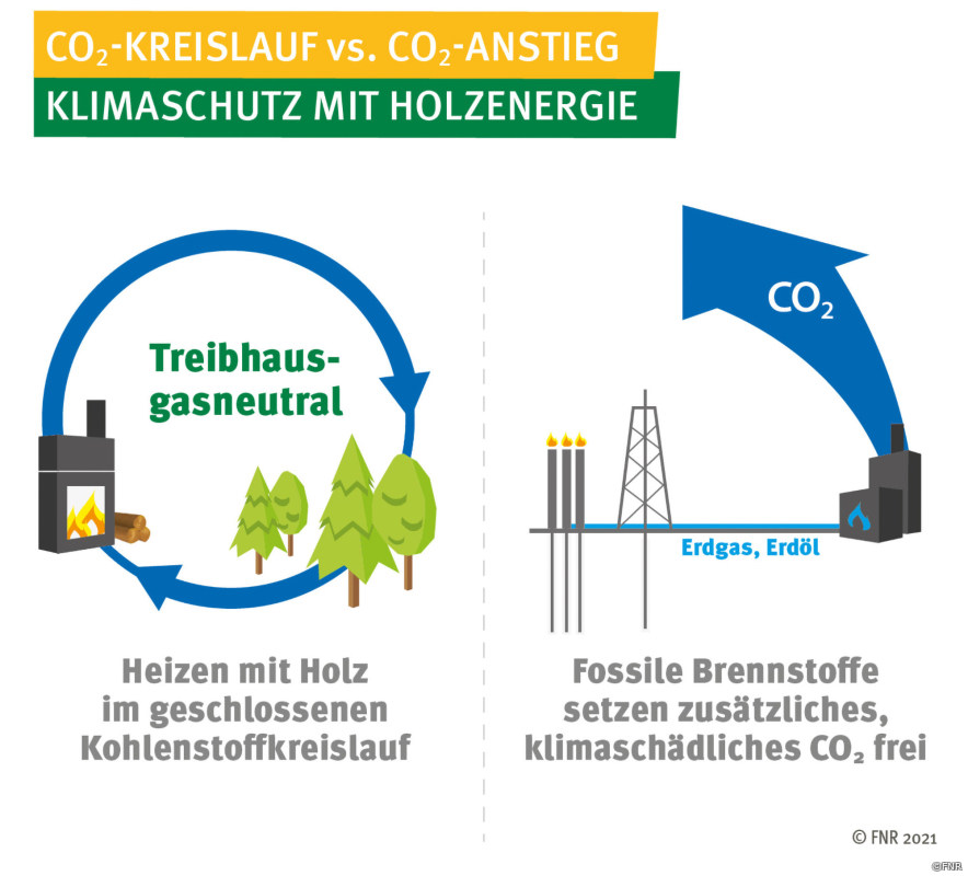 Eine neue Grafik der Fachagentur Nachwachsende Rohstoffe (FNR) verdeutlicht den klimafreundlichen Kohlenstoffkreislauf: Bäume benötigen zum Wachsen unter anderem Sonnenenergie und Kohlendioxid und speichern Kohlenstoff und Energie im Holz. Beim Heizen mit Holz wird die gespeicherte Sonnenenergie als Wärme wieder frei. Der Kohlenstoff geht als Kohlendioxid zurück in die Atmosphäre. Es wird nur so viel Kohlendioxid frei, wie der Baum im Wachstum als Kohlenstoff im Holz gespeichert hat. Zeitgleich heranwachsende Bäume gleichen die Emissionen wieder aus, denn sie binden Kohlendioxid aus der Atmosphäre. Der Kohlenstoffkreislauf ist geschlossen.