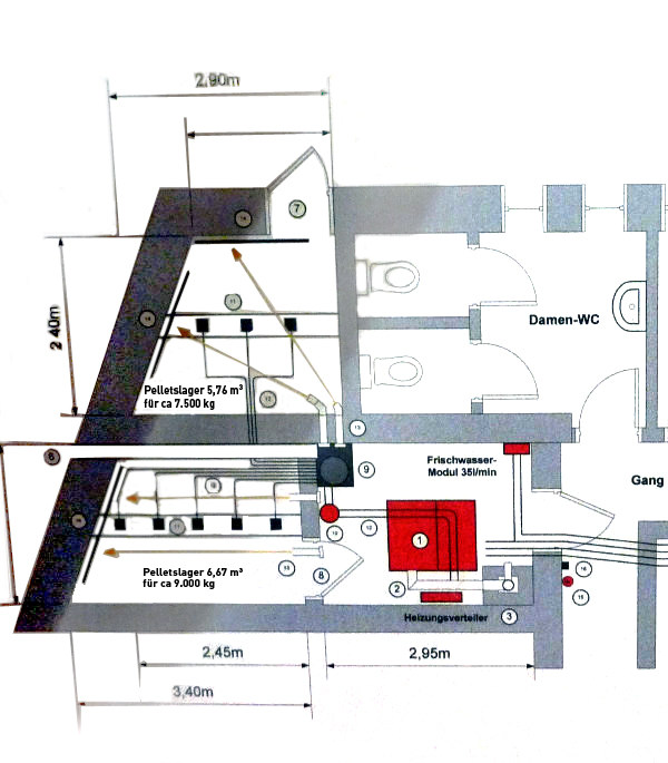 Im Landgasthaus Schillinger bietet der kleinere Lagerraum mit einer Fläche von 5,76 m² zukünftig Platz für rund 7,5 Tonnen Pellets, im angrenzenden zweiten Lagerraum mit 6,67 m² können rund 9 Tonnen Pellets gelagert werden (Siehe Abbildung Lagerraumplanung). Durch die pneumatische Funktionsweise ist auch die Pellets-Zufuhr aus zwei unterschiedlichen Lagerräumen kein Problem. Die Ansaugung erfolgt über acht Sonden, die auf die beiden Lagerräume entsprechend deren Größe(fünf plus drei Sonden) verteilt wurden. Eine automatische Umschalteinheit gewährleistet den abwechselnden Betrieb der dieser Sonden und sorgt dafür, dass beide Pelletslager gleichmäßig geleert werden. Dieses übrigens am Markt einzigartige Fördersystem funktioniert gänzlich wartungsfrei und vollkommen sicher, da im Bereich des Lagerraums auf bewegliche Teile und elektrische Leitungen verzichtet werden kann.