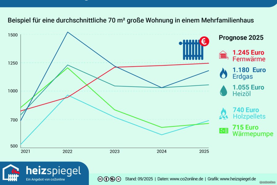 Die Heizkosten in Deutschland steigen dieses Jahr spürbar an. Besonders betroffen sind Haushalte mit einer Gasheizung. Das geht aus dem aktuellen Heizspiegel für Deutschland 2025 von co2online hervor, der auf der Auswertung von über 90.000 Gebäudedaten basiert. Demnach werden Gas (plus 15 Prozent) und Holzpellets (plus 20 Prozent) werden deutlich teurer, während die Kosten für Wärmepumpen (plus fünf Prozent), Heizöl (plus drei Prozent) und Fernwärme (plus zwei Prozent) nur moderat ansteigen. Hauptursachen sind höhere Energiepreise und der kalte Winter zu Jahresbeginn. Das Heizen mit Wärmepumpen ist seit 2022 günstiger als mit Erdgas und Heizöl, seit 2023 auch das Heizen mit Holzpellets. Fossile Energien sind nach wie vor teurer als vor der Energiekrise. „Der Heizspiegel zeigt klar: Fossile Heizungen werden zur Kostenfalle“, sagt co2online-Geschäftsführerin Tanja Loitz.
