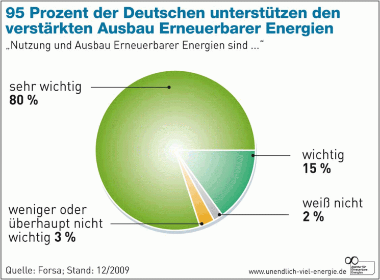Laut einer aktuellen Forsa-Umfrage ist die Mehrheit der Bundesbürger für einen unveränderten Ausbau erneuerbarer Energien. 95 Prozent der mehr als 1.000 Befragten halten den Ausbau der alternativen Energien für wichtig bis sehr wichtig. Die Studie im Auftrag der Agentur für Erneuerbare Energien ergab zudem: Investitionen sollten weniger in herkömmliche Energieträger wie Öl, Kohle oder Atomkraft fließen – 76 Prozent sind dafür, die Förderung alternativer Energien weiterhin auf hohen Niveau zu halten. Hierfür sollen auch die Kommunalpolitiker stärker in die Pflicht genommen werden: rund 81 Prozent der Befragten erwarten ein verstärktes Engagement auf Landesebene.