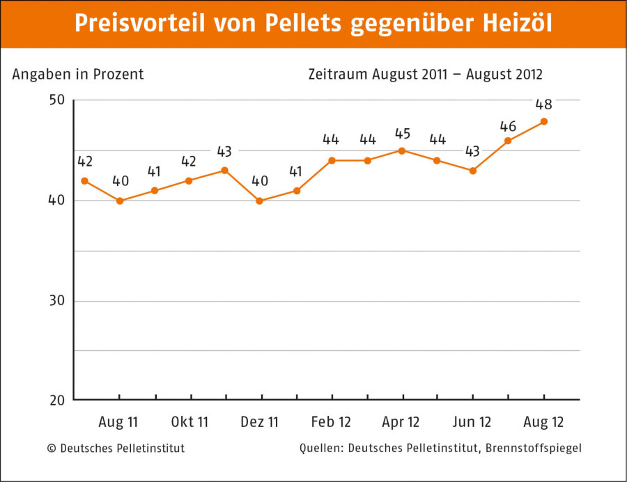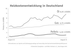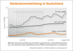 Der DEPV-Index ist der Durchschnittspreis für Holzpellets in Deutschland. Er liegt im August bei 228,41 EUR/t. Detailliert erhebt der DEPV den Pelletpreis in drei Regionen: In Süddeutschland sind Pellets mit 224,26 EUR/t am günstigsten, wenn 6 t abgenommen werden. In der Mitte der Republik kostet eine Tonne der kleinen Presslinge 230,80 EUR, in Nord- und Ostdeutschland zahlen Pelletheizer pro Tonne Qualitätspellets 236,26 EUR. Größere Mengen (26 t) wurden im August 2012 zu folgenden Konditionen gehandelt: Süd: 211,98 EUR/t, Mitte: 216,03 EUR/t, Nord/Ost: 219,67 EUR/t.