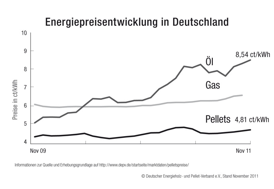 Besitzer einer Holzpelletsheizung müssen nicht mit Preissprüngen zu Beginn der kalten Jahreszeit rechnen. Im Gegensatz zu den aktuell rapide ansteigenden Preisen für fossile Energie verharrt der Pelletspreis auf einem stabil niedrigen Niveau. Das teilt der Deutschen Energieholz-und Pellet-Verband (DEPV) mit. Laut dem DEPV-Index liegt der Durchschnittspreis für Holzpellets in Deutschland im November bei 235,99 Euro je Tonne. Gegenüber dem Vormonat bedeutet das einen saisonal bedingten, leichten Anstieg von 1,4 Prozent. Eine Kilowattstunde Wärme aus Pellets kostet danach 4,81 Eurocents. Damit ist das Heizen mit Pellets 44 Prozent günstiger als mit Heizöl und rund 30 Prozent günstiger als mit Erdgas.