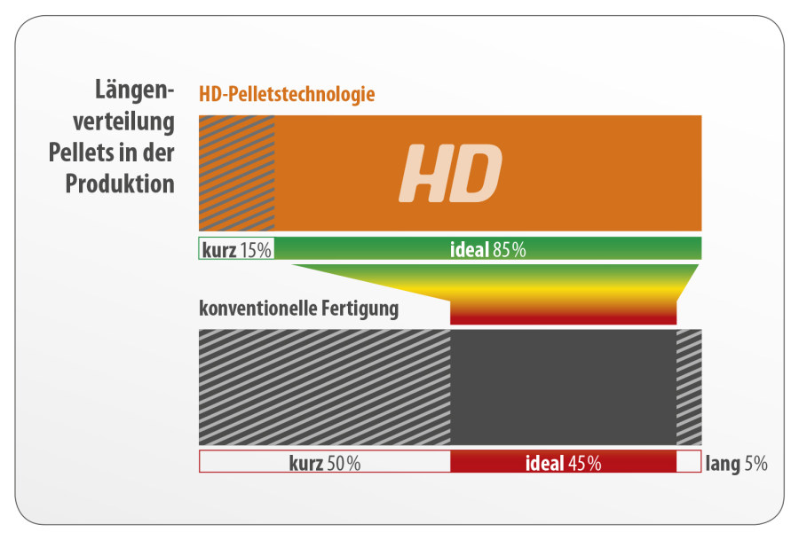 Die langen Pellets wollen wir nicht, da sie sich genau wie die ganz kurzen und der Bruch negativ auf das Fließverhalten auswirken. Sie verhalten sich oftmals störend in der Fördertechnik von Kesseln, Lagern und Öfen. Ich rede nicht von Überlängen, sondern von langen Pellets in der normkonformen Fraktion bis 39 Millimeter. Überlängen sind mit HD sowieso kein Thema mehr.