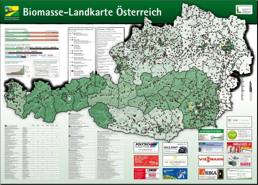Eine Biomasse-Landkarte hat der Österreichische Biomasse-Verband (ÖBV) herausgegeben. Sie stellt die Standorte aller Biomasse-Heizwerke, Biomasse-Kraftwärmekopplungsanlagen und Biogasanlagen dar. Außerdem verzeichnet sie die Firmensitze der Hersteller von Biomasseheizungen und der Produzenten von Holzpellets. Auch Biowärme-Installateure und -Rauchfangkehrer sowie Schulen und Forschungseinrichtungen lassen sich auf der Landkarte finden.