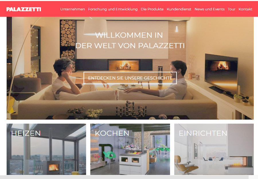 In vier Sprachen können sich Interessierte künftig auf der neuen Palazzetti-Internetseite über die Produkte des italienischen Unternehmens erkundigen: auf deutsch, englisch, französisch und italienisch. Zur besseren Orientierung hat es die drei Kapitel Heizen, Kochen und Einrichten eingearbeitet, in die sich seine Produkte jetzt unterteilen. Auf diese Weise will Palazzetti eine gezielte Auswahl des Produkts ermöglichen, das den eigenen Bedürfnissen am besten entspricht. Ob Backöfen, Holzkamine, Pelletsanlagen oder Verkleidungen – beim Surfen im reichhaltigen Katalog finden Sie detaillierte Informationen und genaue Angaben zu den technischen Merkmalen der Produkte. In ihrem Onlinemagazin “The Warm Street Journal” berichtet die Firma zudem über verschiedene interessante und ständig aktualisierte Themen aus der Welt von Design, Essen und Lifestyle – allerdings nur in drei Sprachen: englisch, französisch und italienisch. Ein deutsches Format fehlt bislang.