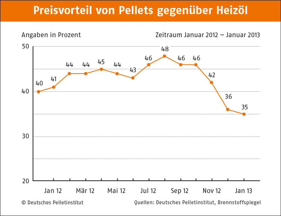 Zu Jahresbeginn kostet ein Kilogramm Holzpellets in Deutschland durchschnittlich 26,19 Eurocent. Wie der Deutsche Energieholz- und Pellet-Verband e.V. (DEPV) berichtet, erhalten Kunden eine Kilowattstunde Wärme aus Pellets für 5,34 Cent. Der Preisindex des DEPV steht im Januar 2013 bei 261,86 Euro pro Tonne. Im Vergleich zum Dezember sind das knapp 2,2 Prozent mehr. Der Preisvorteil von Pellets gegenüber Heizöl beträgt 35 Prozent.