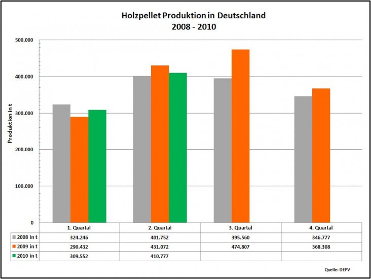 Gegenüber dem ersten Quartal 2010 ist eine Erhöhung der Produktion um rd. 100.000 t zu verzeichnen. Der Deutsche Energieholz- und Pellet-Verband e.V. (DEPV) erhebt die Produktionszahlen quartalsweise. DEPVGeschäftsführer Martin Bentele bezeichnete das aktuelle Produktionsniveau als „sehr gute Basis für eine umfassende Versorgungssicherheit der Verbraucher“. Insgesamt wurden in Deutschland damit bislang im Jahr 2010 rd. 720.000 t Pellets produziert, was exakt der Menge aus dem ersten Halbjahr des Vorjahrs entspricht. Danach bleibt Deutschland bei der Pelletproduktion in Europa weiterhin Spitzenreiter. (siehe Grafik unten)