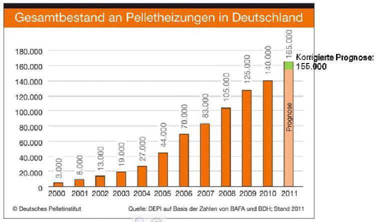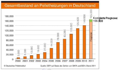 2011 bleibt der Markt für Pelletsheizungen in Deutschland hinter den Erwartungen zurück. Der Deutsche Energieholz-und Pelletverband (DEPV) erwartet, dass wie im vergangenen Jahr nicht mehr als 15.000 Pelletheizungen verkauft werden. Er hat damit seine ursprüngliche Prognose um fast die Hälfte heruntergeschraubt. “Damit unterscheidet sich der Pelletmarkt nicht wesentlich vom restlichen, insgesamt lahmenden Heizungsmarkt”, sagt DEPV-Geschäftsführer Martin Bentele. Wenn es der Politik nicht bald gelänge, Schwung in die energetische Gebäudesanierung zu bringen, gefährde sie die gesamte Energiewende. Zusammen mit dem Bundesverband Erneuerbare Energien fordert der DEPV einen Mix aus einer haushaltsunabhängigen Prämienlösung und der Möglichkeit einer Steuerabschreibung für den Heizungstausch.