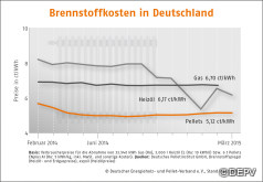 Der Preis für Holzpellets ist im März im Vergleich zum Vormonat minimal gesunken. Pellets kosten im Bundesdurchschnitt 255,85 EUR pro Tonne, wie der Deutsche Energieholz- und Pellet-Verband e.V. (DEPV) berichtet. Das sind 0,3 Prozent weniger als im Februar 2015 und knapp 7 Prozent weniger als im März 2014. Ein Kilogramm Holzpellets kostet entsprechend 25,59 Cent, eine Kilowattstunde (kWh) Wärme aus Pellets 5,12 Cent. Der Preisabstand zu Heizöl beträgt 17 Prozent.