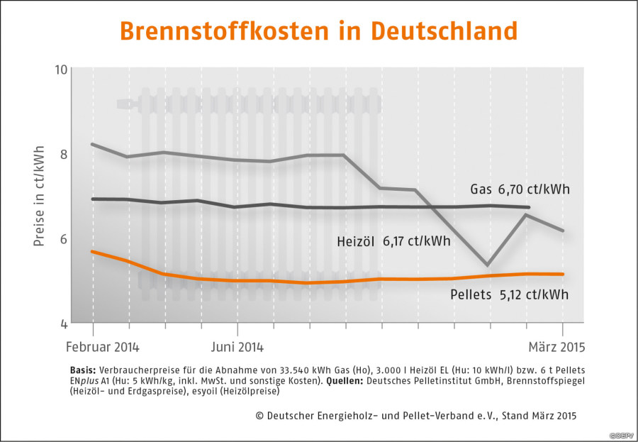 „In den letzten Monaten kann man deutlich sehen, dass Pellet- und Ölpreis unabhängig voneinander sind“, erklärt Martin Bentele, Geschäftsführer vom Branchenverband DEPV. Die heimischen Pelletshersteller produzieren unbeeinflusst von Spekulanten und politischen Krisen transparent nach Angebot und Nachfrage. So bewege sich der Preis mit dem Rohstoffaufkommen je nach Jahreszeit leicht, aber nicht in großen unvorhersehbaren Sprüngen.