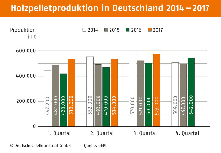 Von Januar bis September 2017 wurden insgesamt 1,645 Millionen Tonnen Holzpellets in Deutschland hergestellt – 18,7 Prozent mehr als im gleichen Zeitraum 2016. “Nachdem der Markt im letzten Jahr aufgrund einiger Firmenübergänge wechselhaft war, hat sich die Produktionsmenge von Holzpellets 2017 auf erfreulich hohem Niveau stabilisiert”, sagt DEPV-Geschäftsführer Martin Bentele. Laut einer Umfrage des Verbandes schätzt die Branche auch die Bevorratung beim Energiehandel als gut ein. Der DEPV hat für 2017 eine Produktionsmenge von 2,3 Millionen Tonnen prognostiziert. Deutschland zählt seit Jahren mit den USA und Kanada und mittlerweile China zu den weltweit größten Pelletsproduzenten.