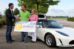 „Welche Menge Pellets steckt im voll aufgeladenen Akku des Tesla Roadster, wenn die Aufladung durch die Strom produzierende Heizung von ÖkoFEN erfolgt?“ Diese Frage hatten die Gewinnspielteilnehmer an den Fachbesuchertagen der Energiesparmesse zu beantworten und konnten so an der Verlosung des Elektrosportwagens teilnehmen.
