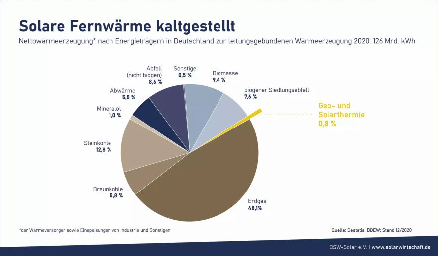 Zwar registriert die Solarbranche in jüngster Zeit ein wachsendes Interesse bei Wärmeversorgern, bislang sind in Deutschland jedoch nur ein paar Dutzend Solarkraftwerke zur Fernwärmeeinspeisung im Megawatt-Maßstab in Betrieb. “Ursache dafür ist, dass die Nutzer fossiler Energieträger deren Gesundheits- und Klimafolgekosten nur zu einem Bruchteil selbst tragen müssen”, erklärt Körnig. Die damit verbundene Wettbewerbsverzerrung zu Ungunsten von Solarpark-Betreibern werde im Wärmesektor weder durch angemessene CO2-Preise noch mittels angemessener Förderangebote ausgeglichen. Anders als in Österreich, wo die Regierung ein Förderung für solare Großanlagen gestartet hat. IN Deutschland liegt die bereits vor Jahren geplante Bundesförderung für effiziente Wärmenetze schon länger auf Eis. Der BSW hält sie zudem mit einem zu kleinen Fördertopf ausgestattet.