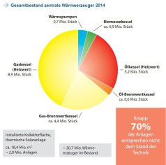 Laut einer Erhebung der beiden Verbände versorgen 20,7 Millionen Wärmeerzeuger deutsche Wohnungen und Häuser mit Wärme. Auf sie entfällt über ein Drittel des deutschen Endenergieverbrauchs und ein Viertel der CO2-Emissionen. Die Erhebung macht deutlich, dass rund 70 Prozent des Anlagenbestandes nicht dem Stand der Technik entspricht. Würden diese veralteten Anlagen modernisiert, könnten zwischen 13 und 15 Prozent des deutschen Endenergieverbrauchs eingespart werden. Das wiederum entspricht in etwa den Energieexporten Russlands nach Deutschland.