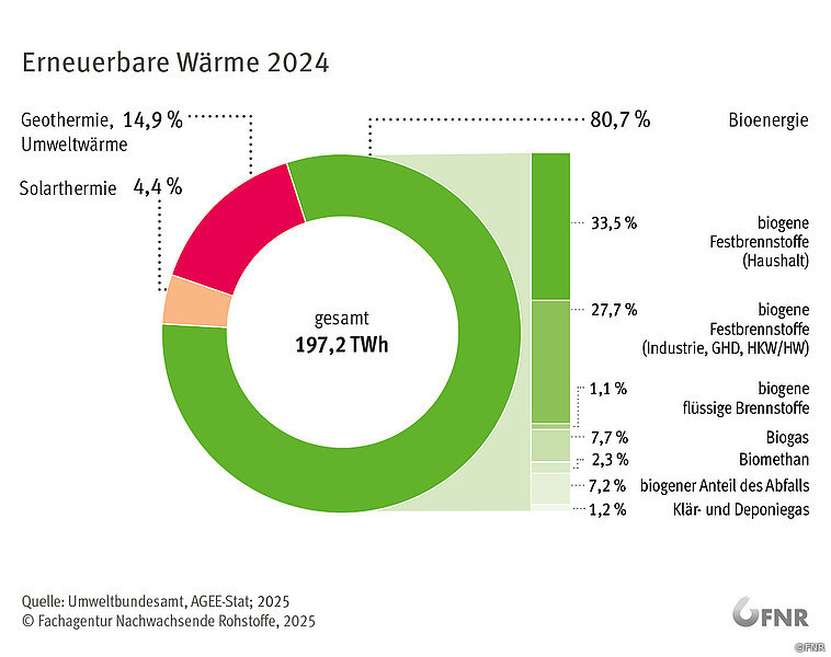 Bioenergie war 2024 mit einem Anteil von über 80 Prozent der Hauptlieferant erneuerbarer Wärme in Deutschland. Wichtigster Energieträger ist Holz, der Beitrag von Biogas und Biomethan hat sich seit 2010 jedoch mehr als verdoppelt. Das geht aus den Zahlen der Arbeitsgruppe Erneuerbare Energien-Statistik beim Bundesumweltamt hervor. Erneuerbare Energien tragen demnach mit rund 18 Prozent zur Wärmeversorgung bei. Sie wird vor allem aus fester Biomasse erzeugt. Hackgut, Holzpellets und Scheitholz werden nicht nur in Öfen und Kesseln privater Haushalte verfeuert, sondern auch in Anlagen für größere Gebäude und für Wärmenetze von Energieversorgern, Kommunen und Unternehmen. Neben Energieholz werden auch Stroh, Miscanthus und sogenannte Paludi-Biomasse aus wiedervernässten Mooren genutzt.