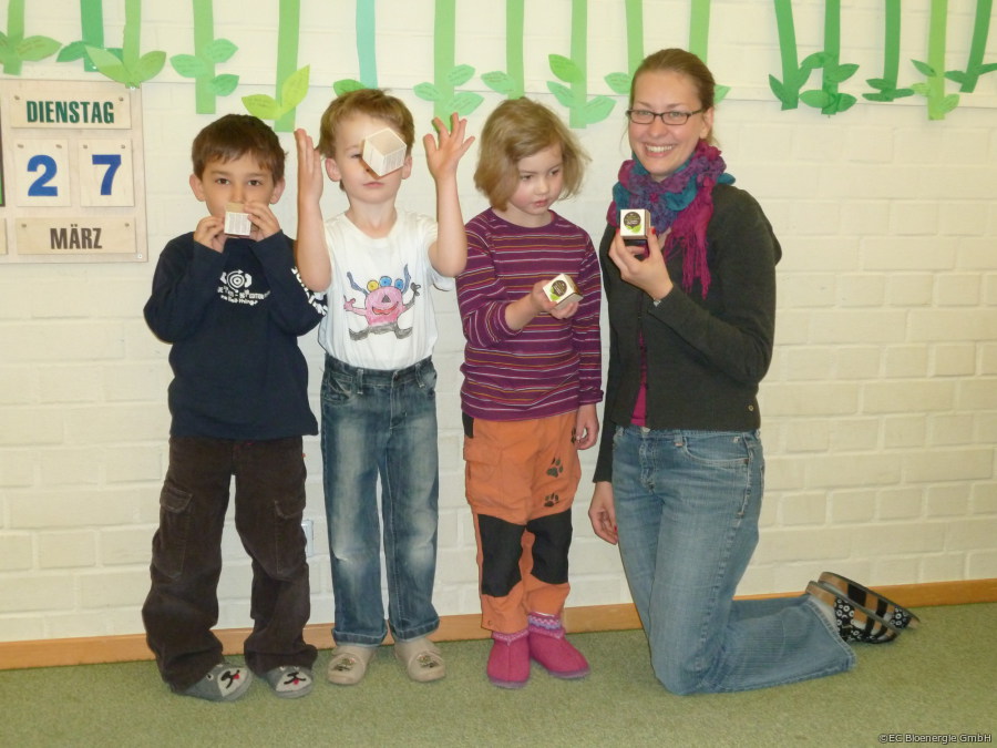 Mit unterschiedlichen Pflanzaktionen, beispielsweise mit Blumensamen oder Gartengemüsen, können die insgesamt 70 Kinder das Wachstum der Pflanzen beobachten. wohl&warm, die Pelletmarke der EC Bioenergie GmbH, hat dem Kindergarten hierzu 70 Holzwürfel gespendet, die mit Fichtensamen gefüllt sind.