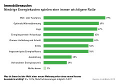 Die Deutschen achten bei der Haus- und Wohnungssuche auf hohe Energiekosten. Für zwei von drei Bundesbürgern sind effiziente Heizungsanlagen und eine gute Wärmedämmung ein Muss, damit eine Immobilie in Frage kommt. Zu diesem Ergebnis kommt eine repräsentative Umfrage unter 1.000 Bundesbürgern im Auftrag des Öko-Energieanbieters Lichtblick AG. Demnach ist die Energieeffizienz für Haus- und Wohnungssuchende genauso wichtig wie die Lage oder die Aufteilung der Zimmer – und noch wichtiger als die Größe des Objekts. Nur der Miet- oder Kaufpreis besitzt ein noch größeres Gewicht.